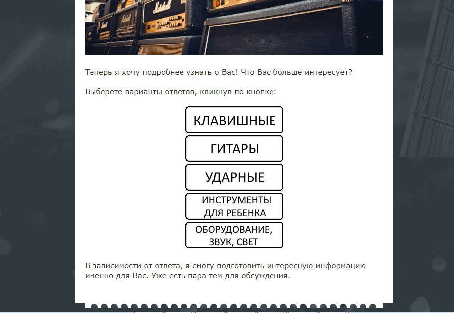 Специалистам TrendKey потребовалось выстроить систему email-маркетинга в магазине с нуля. Так как ниша музыкальных инструментов весьма специфическая, и в ней сосредоточены в основном профессионалы, было принято решение сделать упор на качественный и полезный контент.